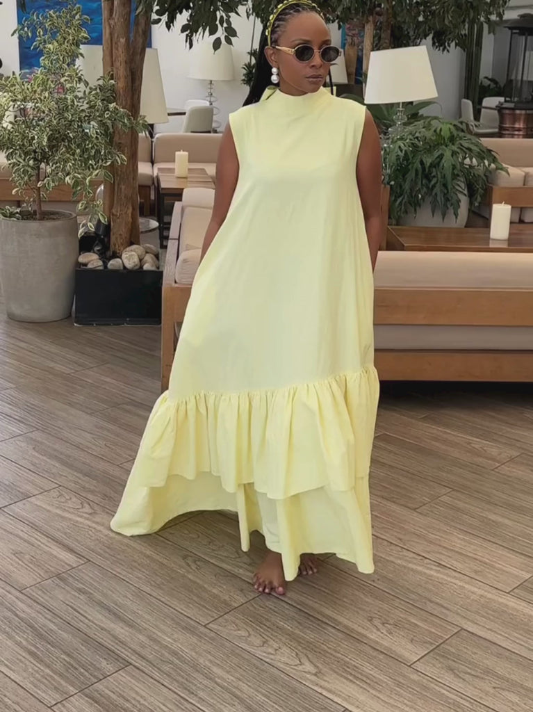 Light, flowing, and quietly striking, this butter yellow asymmetrical hem linen maxi dress is designed to move beautifully with you. Crafted from breathable linen, it features a high, softly structured neckline that balances ease with elegance.
