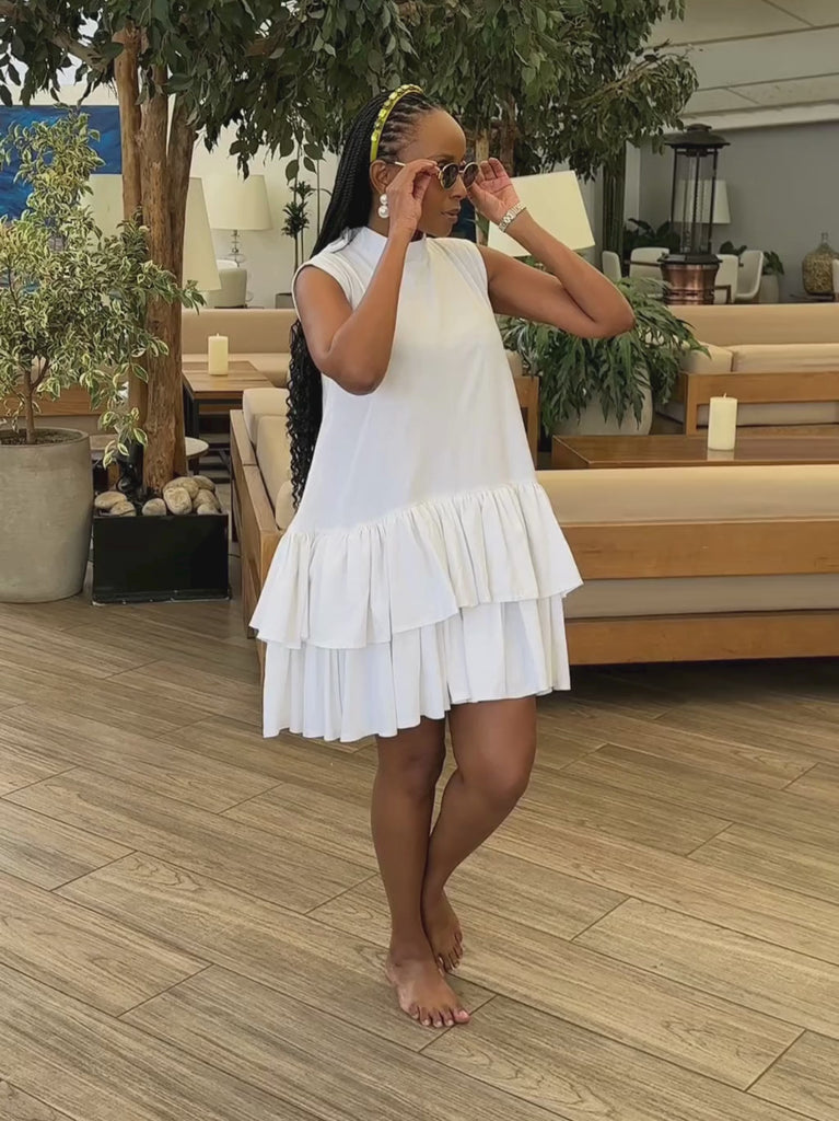 The double-layered construction adds subtle volume and coverage, while the straight hem keeps the look clean and refined. Falling above the knee, this dress is perfect for warm days when comfort and simplicity matter most. The crisp white hue feels timeless, fresh, and endlessly versatile.