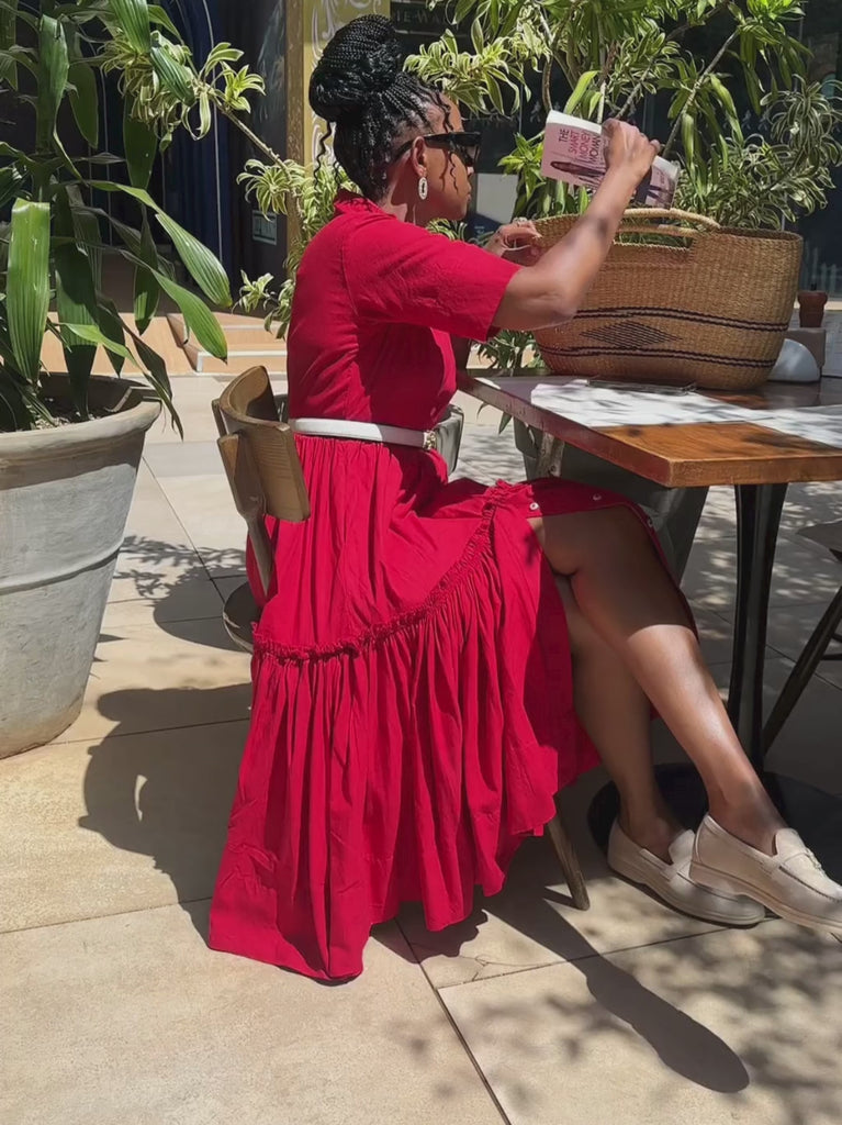 The cinched waist flows into a gently tiered midi skirt, finished with subtle ruffle detailing that adds movement and softness to the strong rouge red hue. Rich, warm, and timeless, this shade elevates the everyday and transitions effortlessly from daytime wear to evening moments.